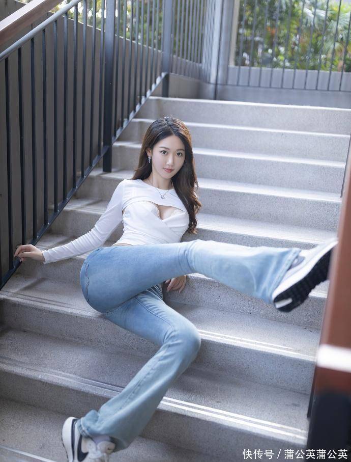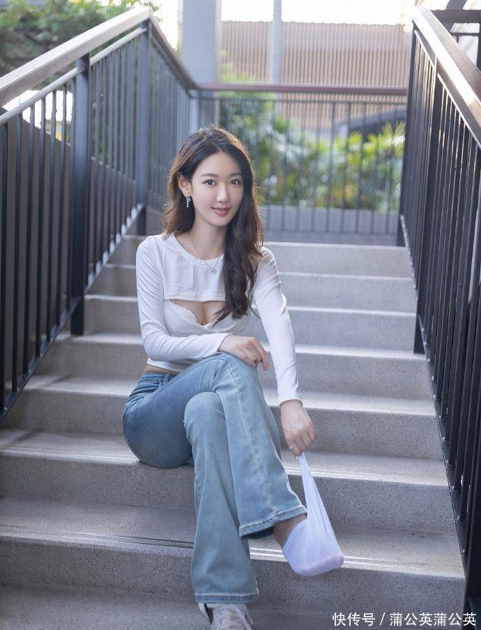 33 岁的唐安琪,这次的穿搭直接把 “简约不简单” 的精髓演活了。白色挖空短上衣 + 浅蓝微喇裤的组合,没有花哨的装饰,却把女性的柔和线条衬得格外吸睛 —— 上衣的收褶设计贴合腰腹,既勾勒出自然的曲线,又不会显得刻意;微喇裤的裤型顺着腿型放宽,把腿部线条衬得修长又流畅,坐在台阶上的姿态,舒展又带着恰到好处的精致感。